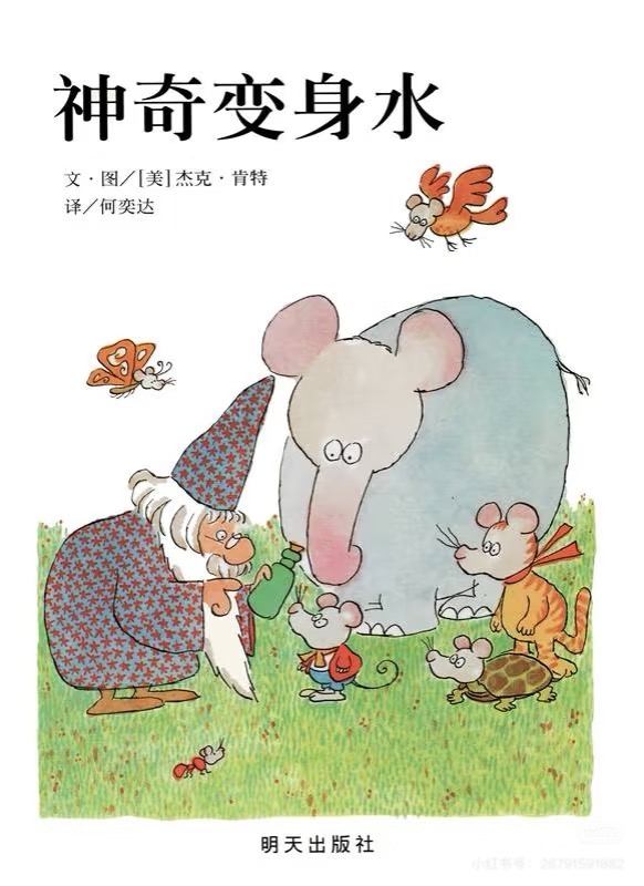 美国绘本大师杰克·肯特的《神奇变身水》讲述了一只厌倦当老鼠的小老鼠,向巫师购买了一瓶无标签的变身水。在打开瓶盖前,它幻想变成蝴蝶、大象甚至猫咪,却在反复思量中意识到每种生物都有烦恼。最终,小老鼠选择归还变身水,领悟到“做自己才是真正的快乐”。